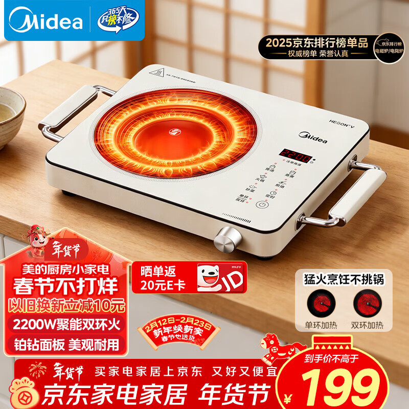自营美的(Midea)电陶炉煮茶电磁炉家用新型电磁灶 2200W大功率智能双环火锅炒菜用火锅电池炉围炉煮茶炉MC-HW22E05
