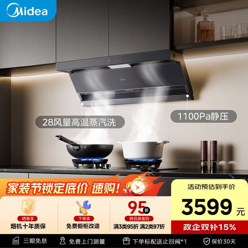 自营美的(Midea)【蒸汽洗AK7max】抽吸排油烟机28风量顶侧双吸变频自清洁烟机可配燃气灶以旧换新