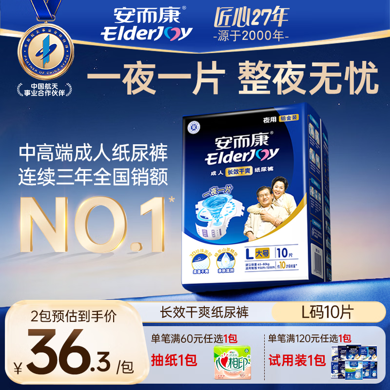 旗舰店安而康长效干爽成人夜用款纸尿裤大号10片 产妇老年人用腰贴式尿不湿