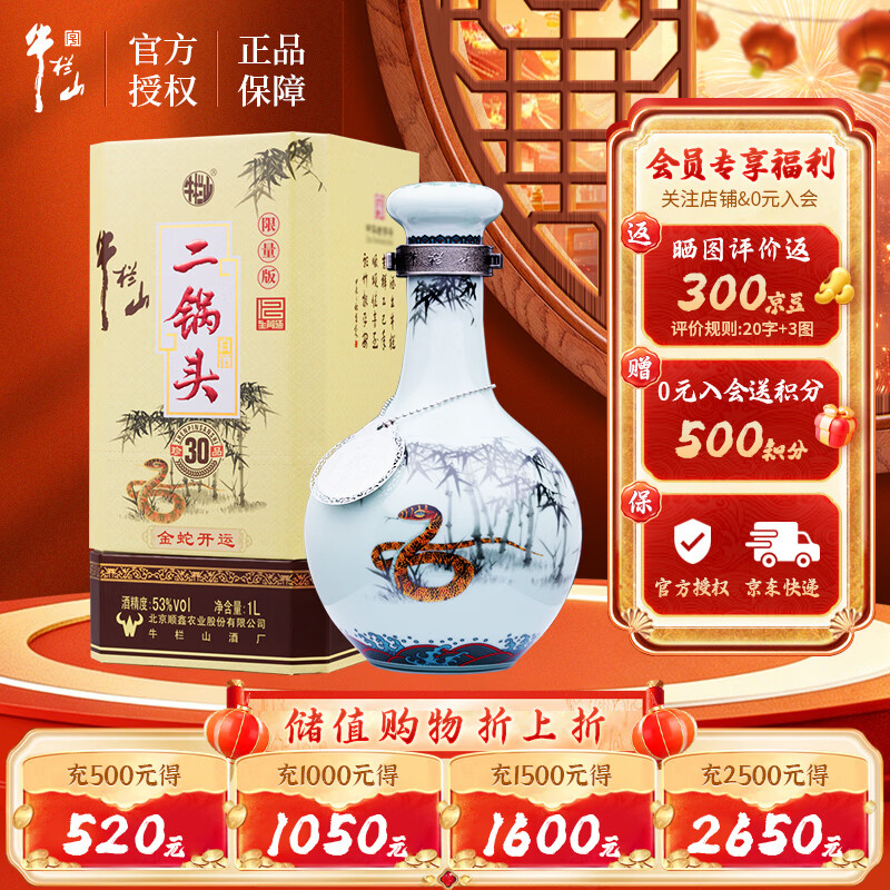 自营牛栏山二锅头青龙 珍品30生肖蛇年 清香型白酒 53度1L*1瓶 年货节送礼