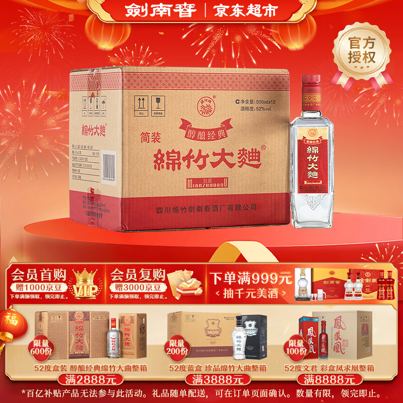 自营剑南春 简装 醇酿经典绵竹大曲 52度 500ml*12瓶 整箱装 浓香型白酒