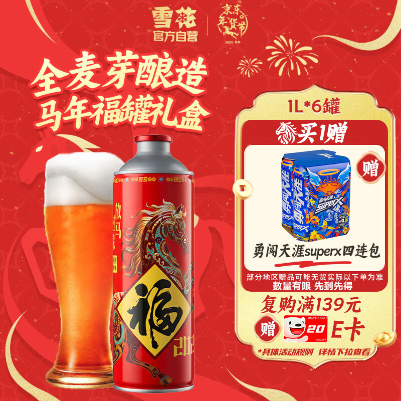 自营雪花啤酒 马年限定福罐礼盒 12.5度1L*6罐 马口铁整箱装