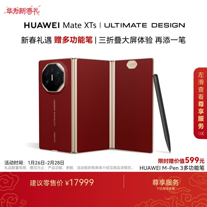 自营HUAWEI Mate XTs 非凡大师 瑞红16GB+256GB三折叠大屏生产力 鸿蒙大屏AI 华为三折叠屏 鸿蒙系统华为手机