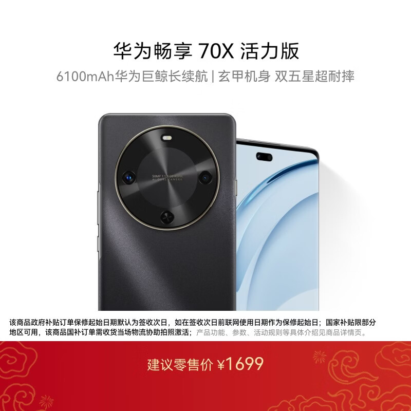 自营华为畅享 70X活力版 256GB 曜金黑 华为巨鲸超能长续航鸿蒙安全双五星超耐摔华为鸿蒙手机