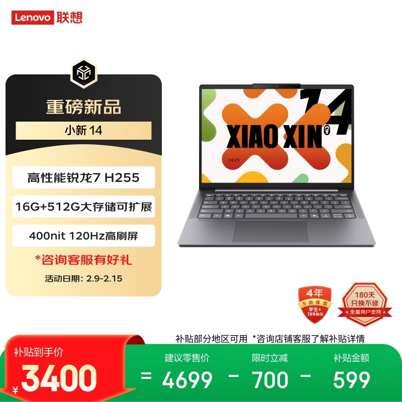 自营联想小新14 14英寸轻薄笔记本电脑(锐龙R7-H255 16G 512G 高色域 400nit 120Hz高刷)