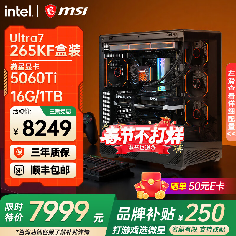 旗舰店微星(MSI)全家桶英特尔Ultra9 285k 265KF 5070Ti 5080显卡设计游戏台式电脑主机组装电脑Deepseek 酷睿U7 265KF+5060TI丨2K高端丨配三