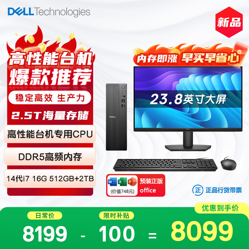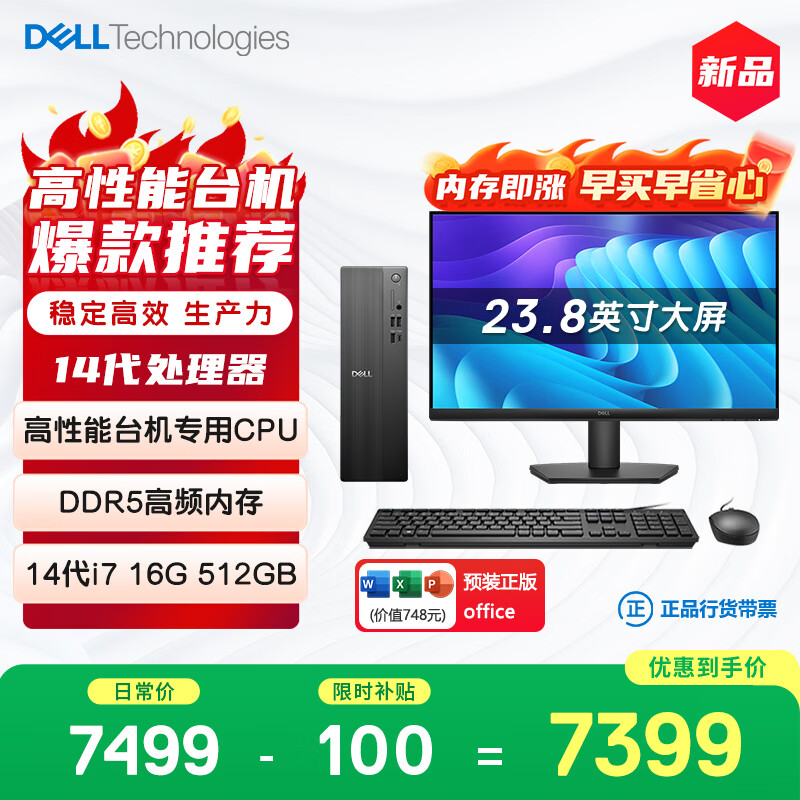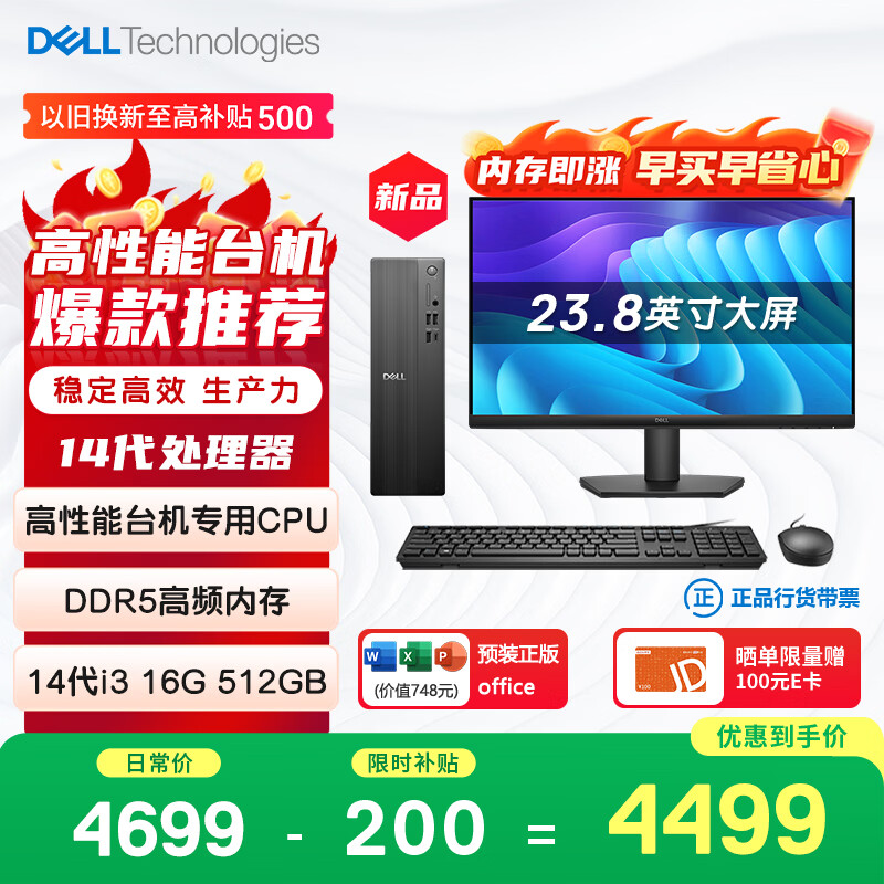 自营戴尔成就 新款 高性能台式电脑主机(14代i3-14100 16G内存 DDR5 512G)23.8护眼大屏 商用办公 教育学习