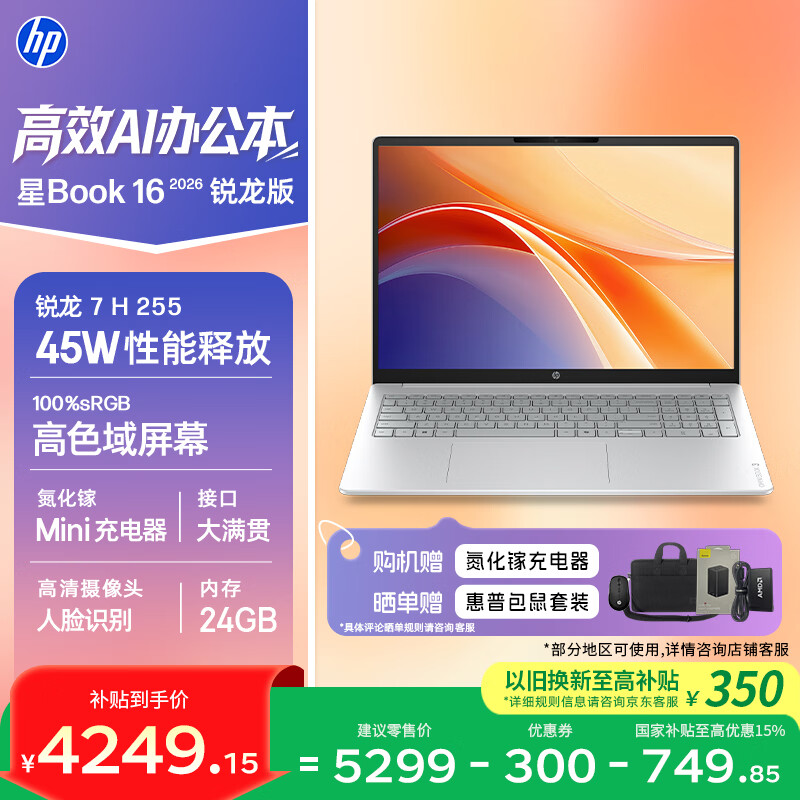 自营惠普HP【国家补贴】星Book 16 2026 16英寸大屏轻薄笔记本电脑(R7 H 255 24G 1TB 100%sRGB AI)银