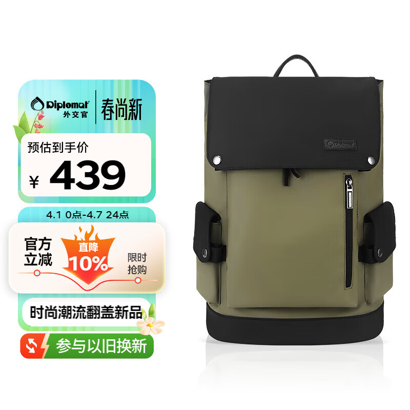 自营Diplomat外交官电脑包商务休闲双肩男女背包旅行包DB-15131L黑色配卡其绿
