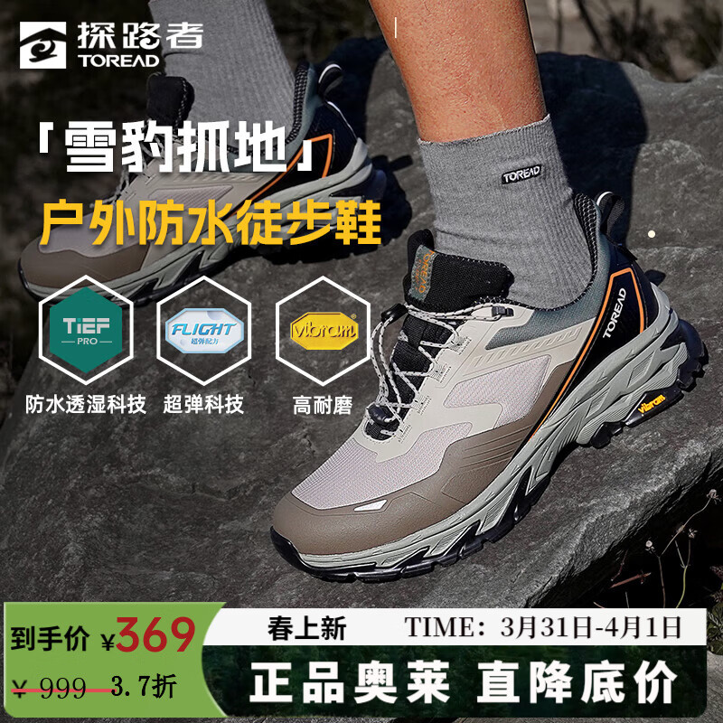 旗舰店探路者(TOREAD)男户外防滑防水雪豹抓地徒步鞋轻量高弹涉水运动登山鞋大牌奥莱 浅卡其黑色 39