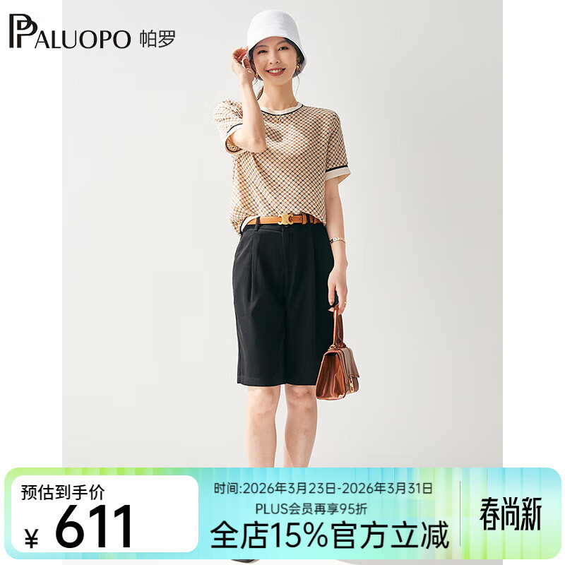旗舰店帕罗(PALUOPO)女士t恤短袖上衣真丝印花100%桑蚕丝宽松休闲圆领夏季新款半袖 夹花米色 M (160/84A)