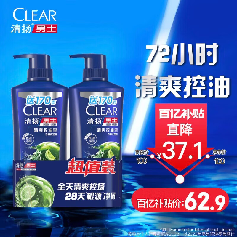 自营清扬男士去屑洗发水清爽控油570gx2 蓬松修护洗发露 京东金榜自营