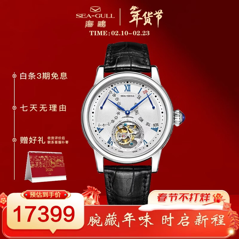 自营海鸥(SEAGULL)手表男陀飞轮自动机械表 男士手表 日历星期鳄鱼皮带男表ST8004ZS