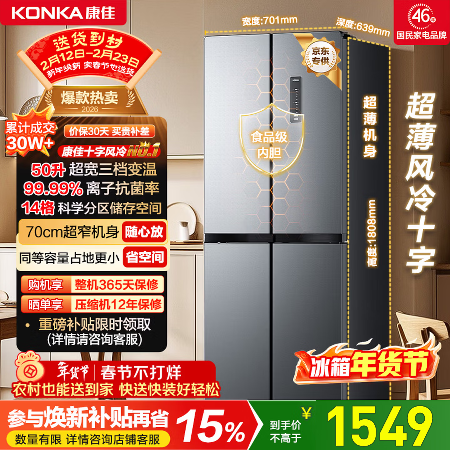 自营康佳408升十字门冰箱智能变频超薄可嵌入一级能效风冷无霜大容量家用电冰箱家电BCD-408WPEG4S国家补贴