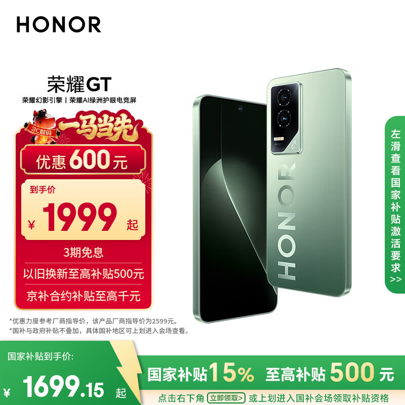 自营荣耀GT 荣耀幻影引擎 第三代骁龙8 荣耀AI绿洲护眼电竞屏 12+512 极光绿 5G AI 新款游戏手机 国家补贴