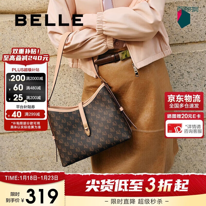 自营百丽【新年礼物】女包复古老花水桶包托特包腋下软包X7023CX4 啡色