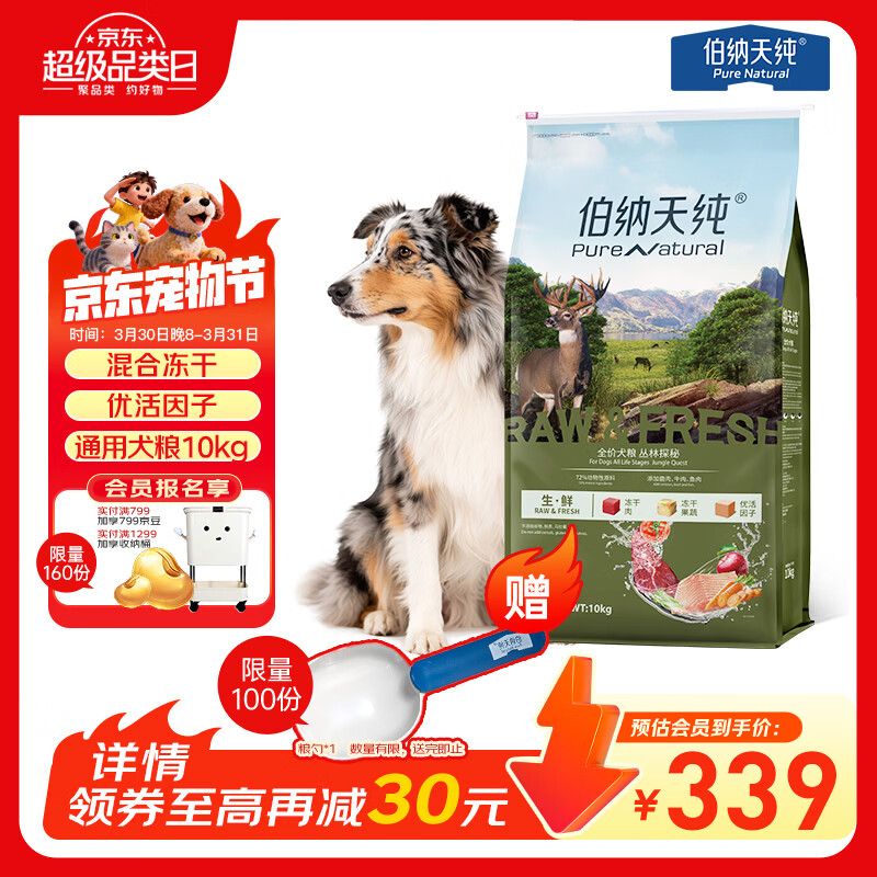 自营伯纳天纯狗粮小型大型犬生鲜丛林探秘新款成犬幼犬泰迪比熊犬粮15kg/30斤