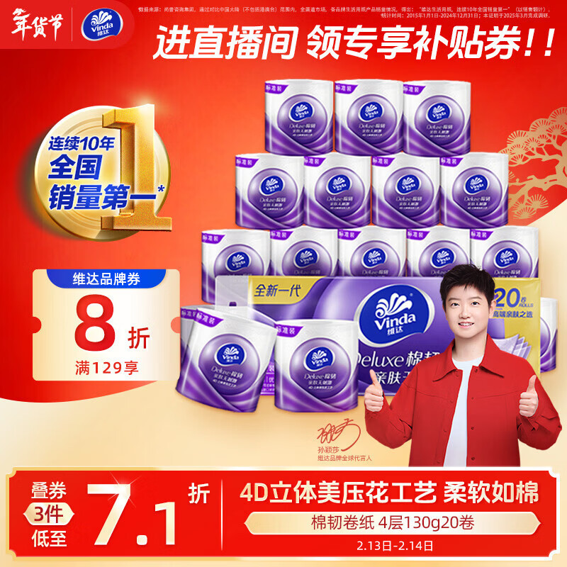 自营维达(Vinda)有芯卷纸 棉韧4层130克*20卷 亲肤无刺激 卫生纸 卷筒纸纸巾 厕纸
