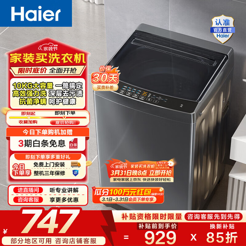 旗舰店海尔(Haier)波轮洗衣机全自动家用租房10公斤大容量懒人去渍洗自编程一体上盖 家电补贴以旧换新EB100Z33Mate1 波轮