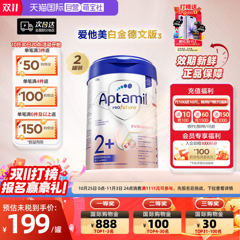 自营【自营】爱他美白金德文版³HMO幼儿配方奶粉2+段800g*2罐新版德国