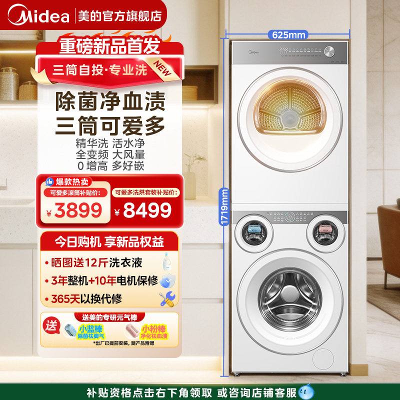 旗舰店[新品上市]美的可爱多四桶洗烘套装三筒分区除菌洗衣机热泵烘干机